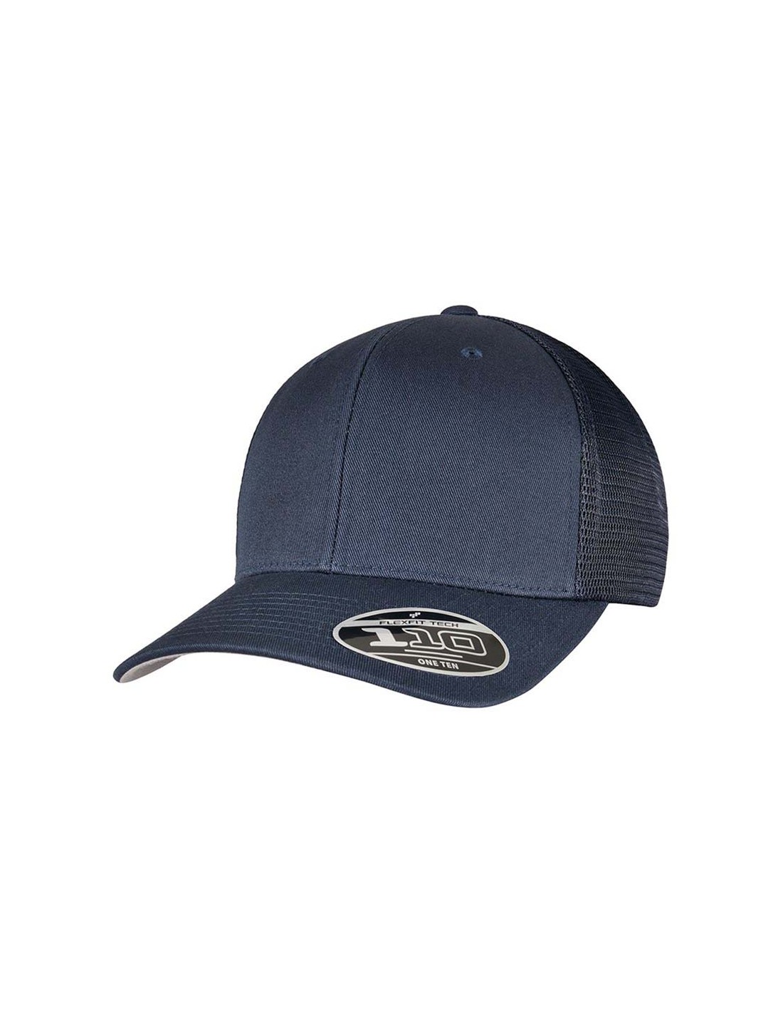 - Plain-colored trucker cap with color-matching snapback closure, made from cotton and polyester, one size fits all, Flexfit 110 technology, 8-fold quilted, pre-bent visor