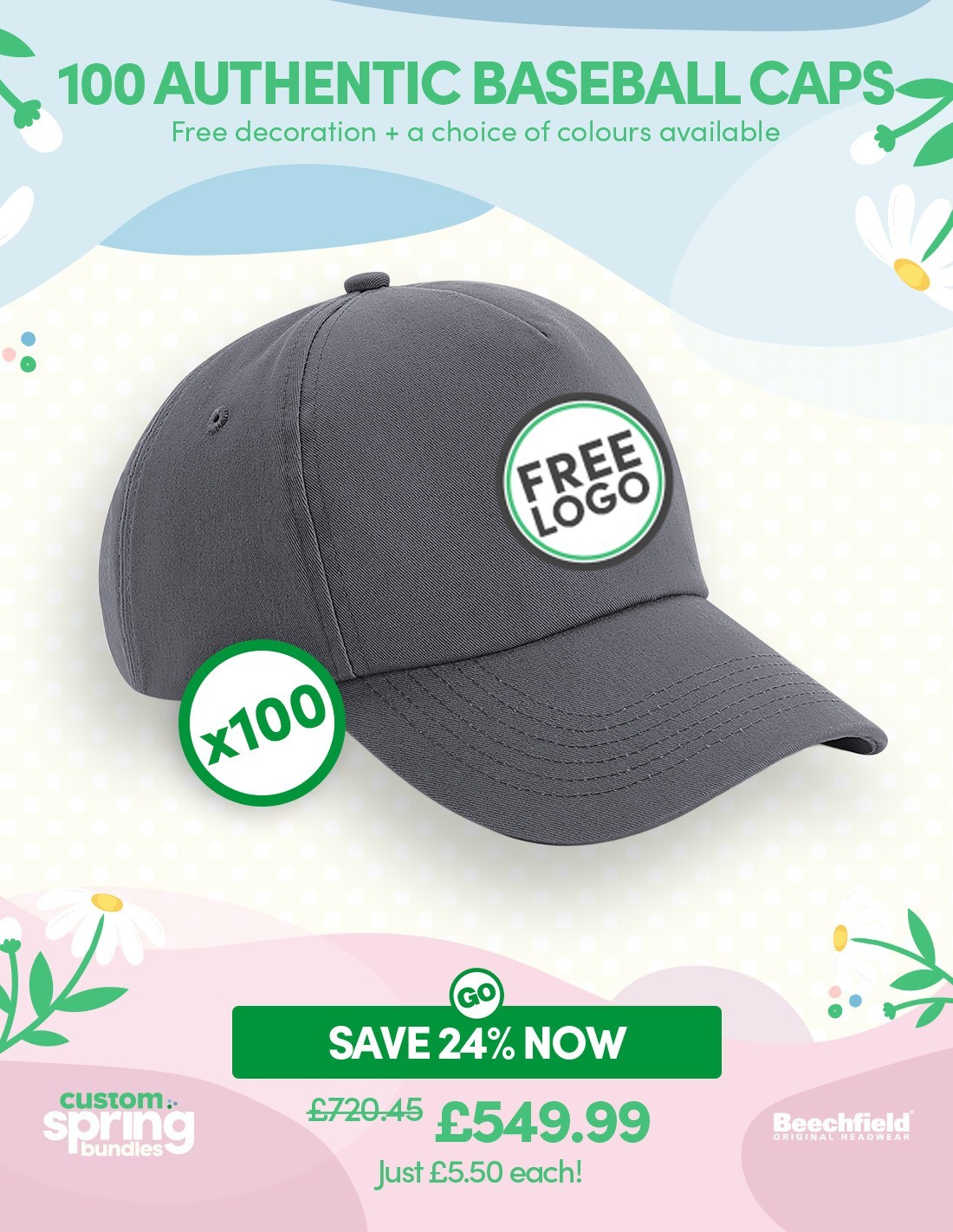 Bundle: 100 x Authentic Panel Baseball Cap with FREE Logo