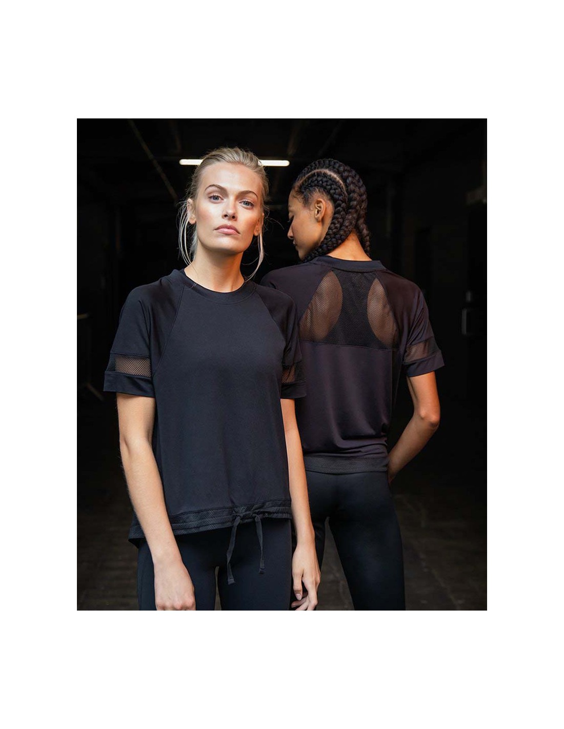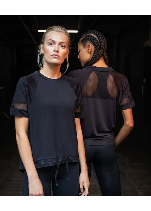 - Oversize T, mesh back yoke and sleeve panels, draw cord hem with panel, lightweight soft hand feel fabric, tear-out label
