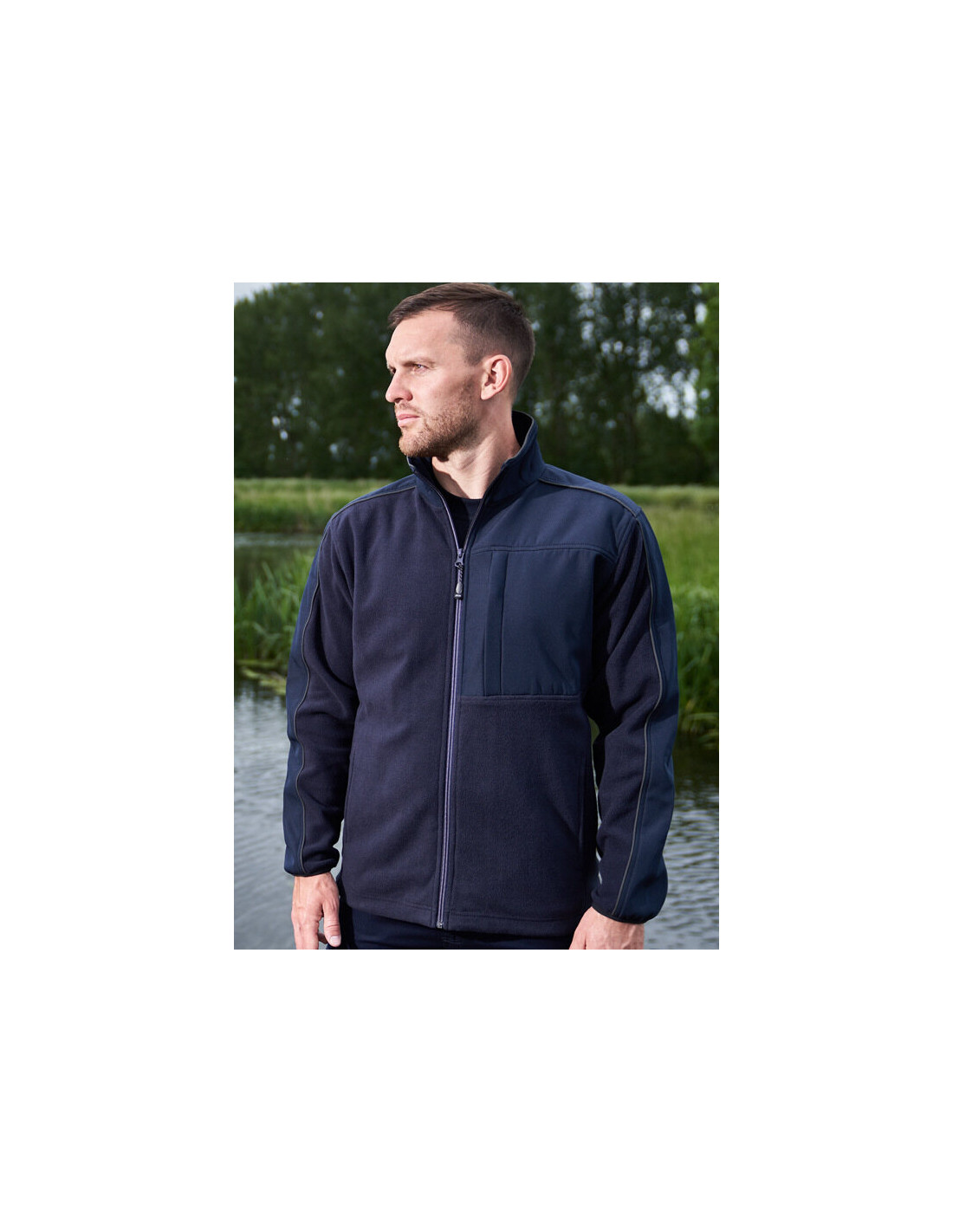 - Fleece body with softshell panels and dark reflective trim for enhanced visibility and safety