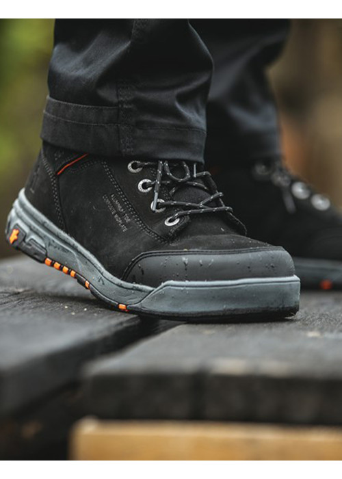 - High-spec S3 antistatic mid-ankle safety boots with water-resistant upper and composite mid-plate for lightweight, flexible protection from sole puncture