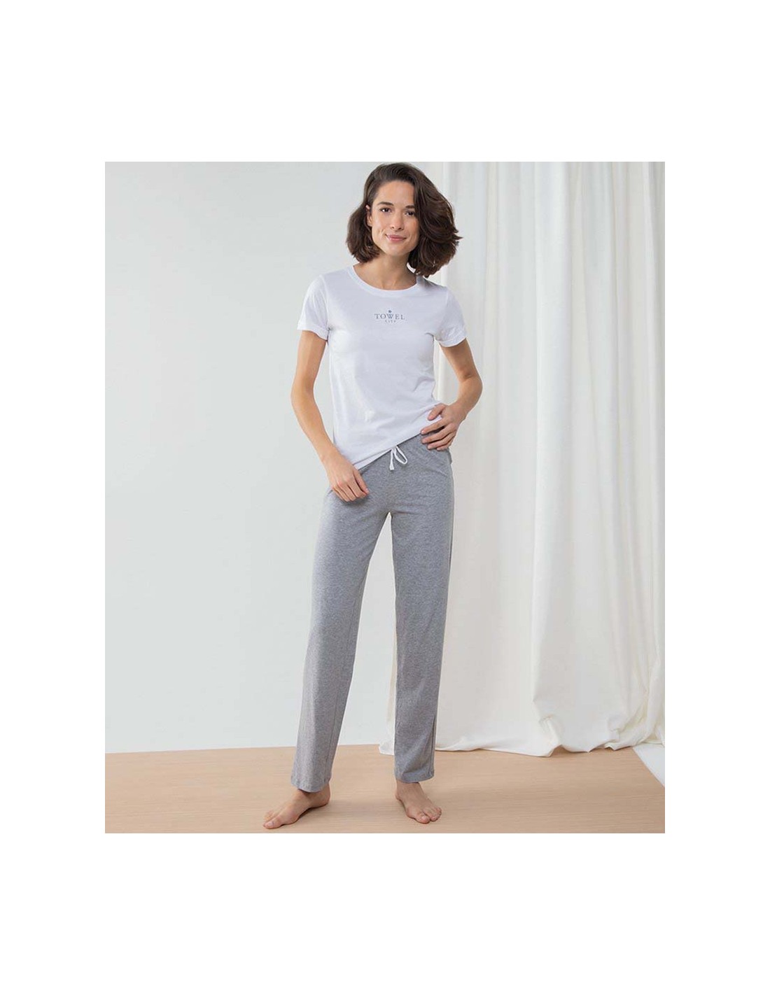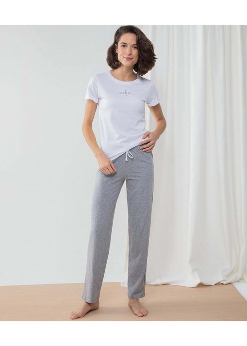 - Women's long pant pyjama set with a white t-shirt with roll up sleeve detail and a looser crew neck