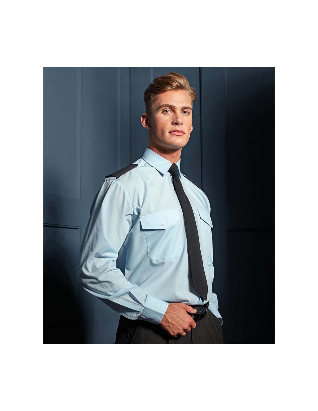 - For those who require a more authoritative work uniform, this men's long sleeve Pilot shirt is ideal as it features tabs on the shoulders that can accommodate epaulettes